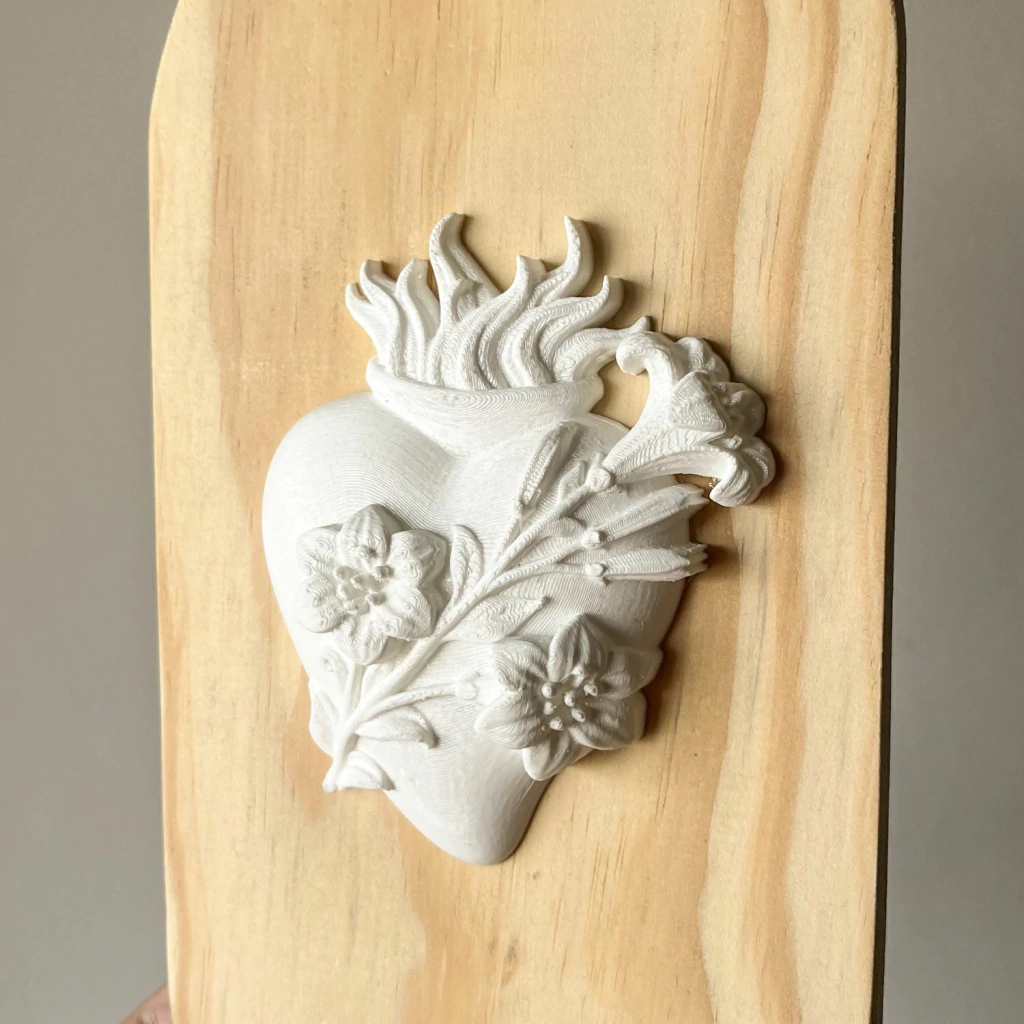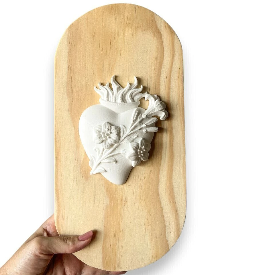 Fixado sobre uma delicada tábua de madeira pinus com cantos arredondados, a peça une o estilo minimalista ao profundo significado espiritual, tornando-se ideal para ambientes de oração, oratórios ou para levar um toque de fé à decoração da casa.
