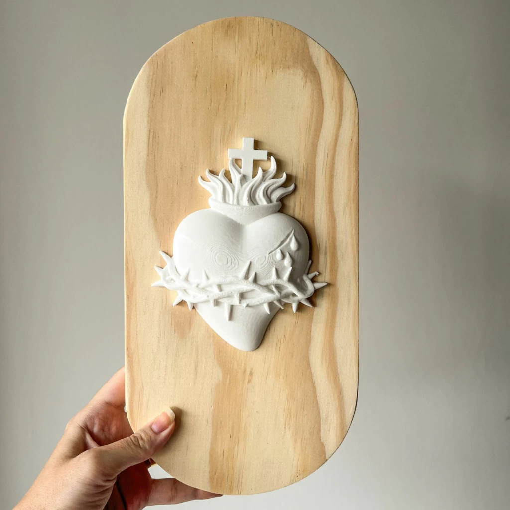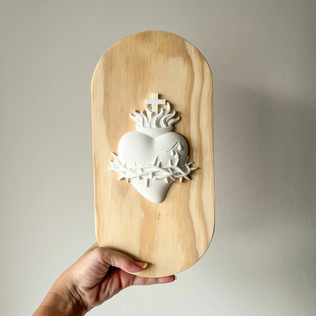 Fixado sobre uma delicada tábua de madeira pinus com cantos arredondados, a peça une o estilo minimalista ao profundo significado espiritual, tornando-se ideal para ambientes de oração, oratórios ou para levar um toque de fé à decoração da casa.