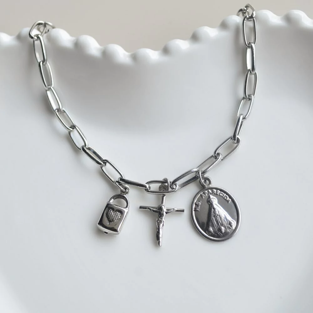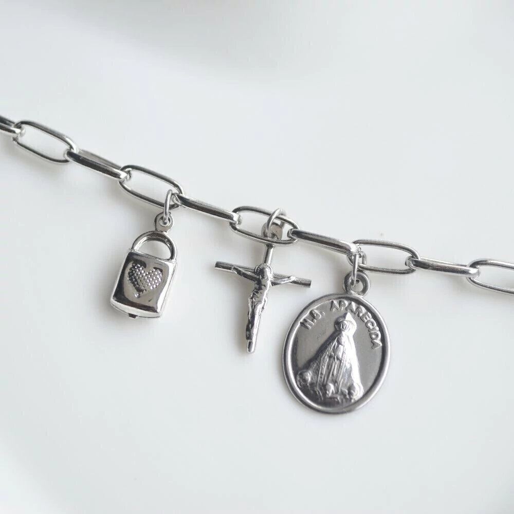 A pulseira Cadeia Nossa Senhora Aparecida é uma peça especial, ideal para aqueles que se consagram ou se preparam para a consagração à Virgem Maria, segundo o método de São Luís Maria Grignion de Montfort. Este método ensina que a consagração a Maria é um caminho profundo e eficaz para aproximar-se de Jesus Cristo. Feita inteiramente em aço inox, a pulseira oferece durabilidade e resistência ao longo do tempo. Ela possui três pingentes significativos: um crucifixo, simbolizando a fé, um cadeado, representando o compromisso da consagração, e a medalha de Nossa Senhora Aparecida, padroeira do Brasil, evocando sua intercessão e proteção especial para todos os seus devotos.