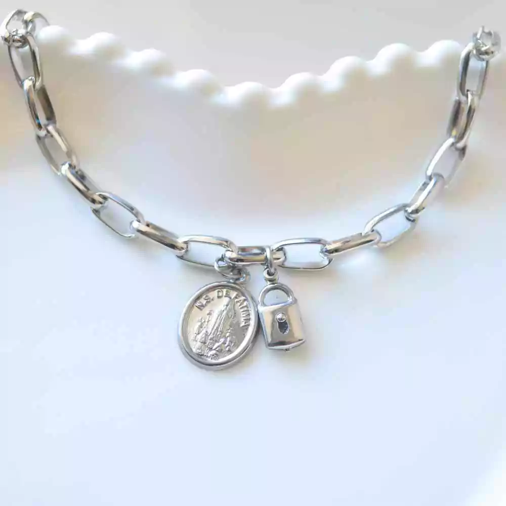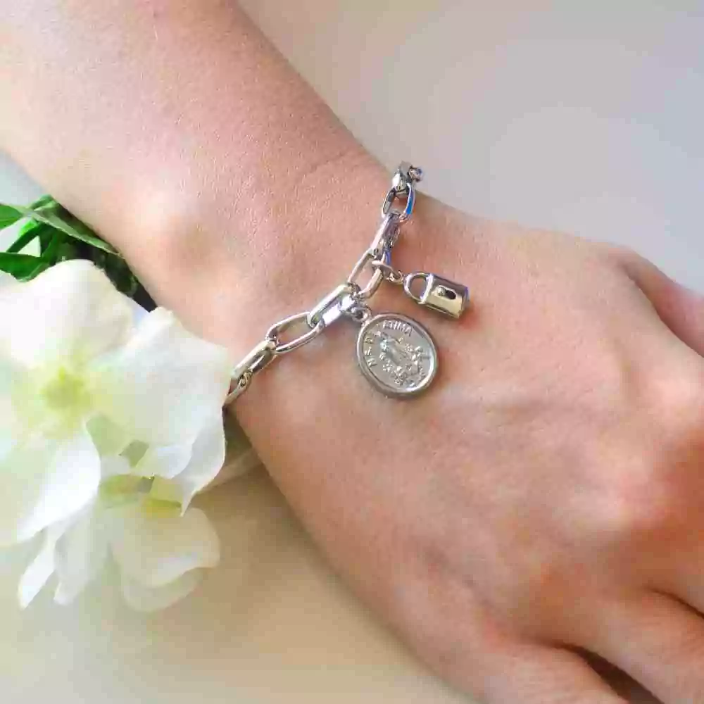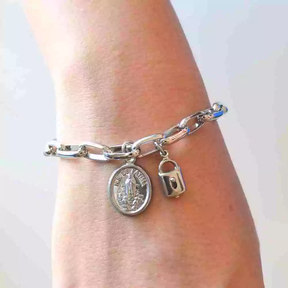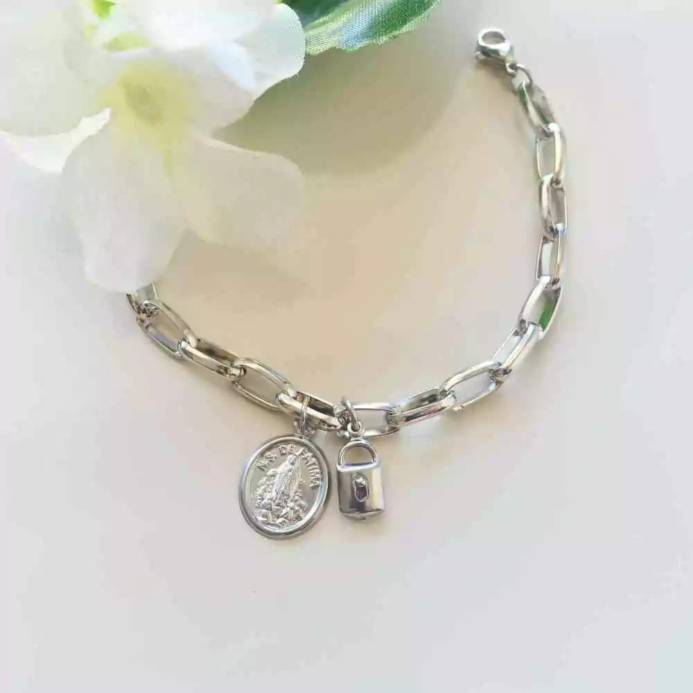 A pulseira de aço inox com pingente de Nossa Senhora de Fátima é uma peça única para quem deseja expressar sua devoção e fé na Virgem Maria. Feitos inteiramente em aço inoxidável, a pulseira e os pingentes são resistentes à oxidação e duráveis, o que torna essa cadeia perfeita para uso diário e resistente ao desgaste. O pingente com a imagem de Nossa Senhora de Fátima traz consigo a fé e a devoção àquela que apareceu aos pastorinhos em Fátima, Portugal, transmitindo uma mensagem de paz, oração e esperança ao mundo.