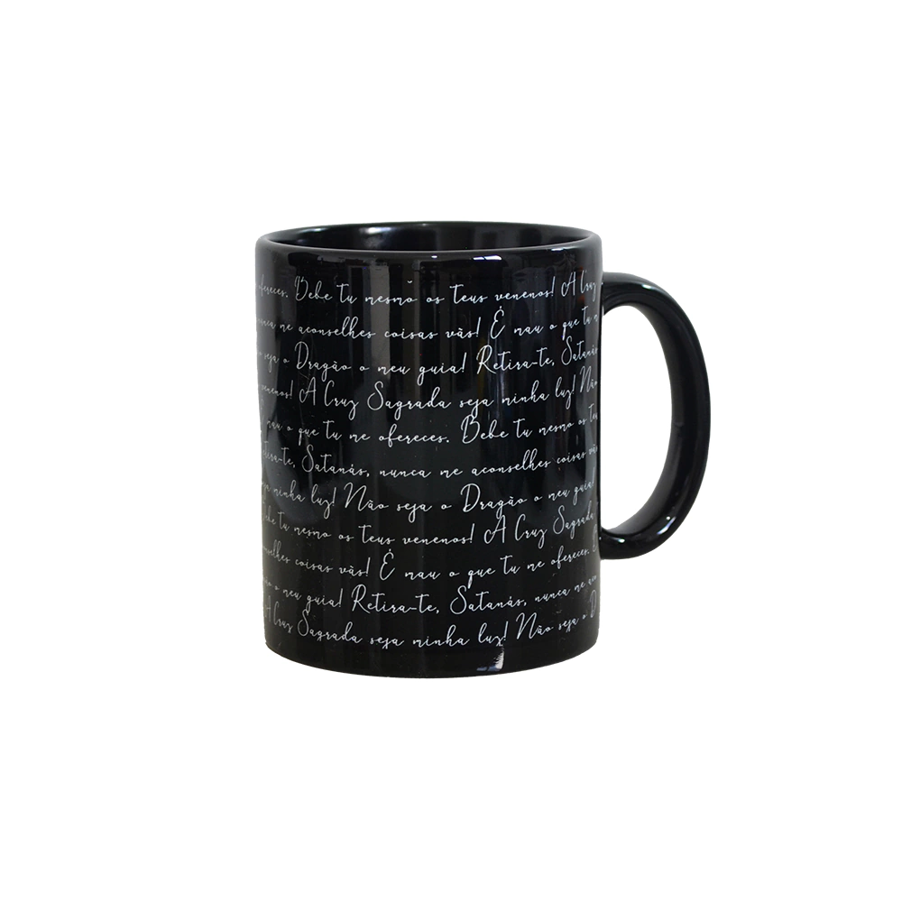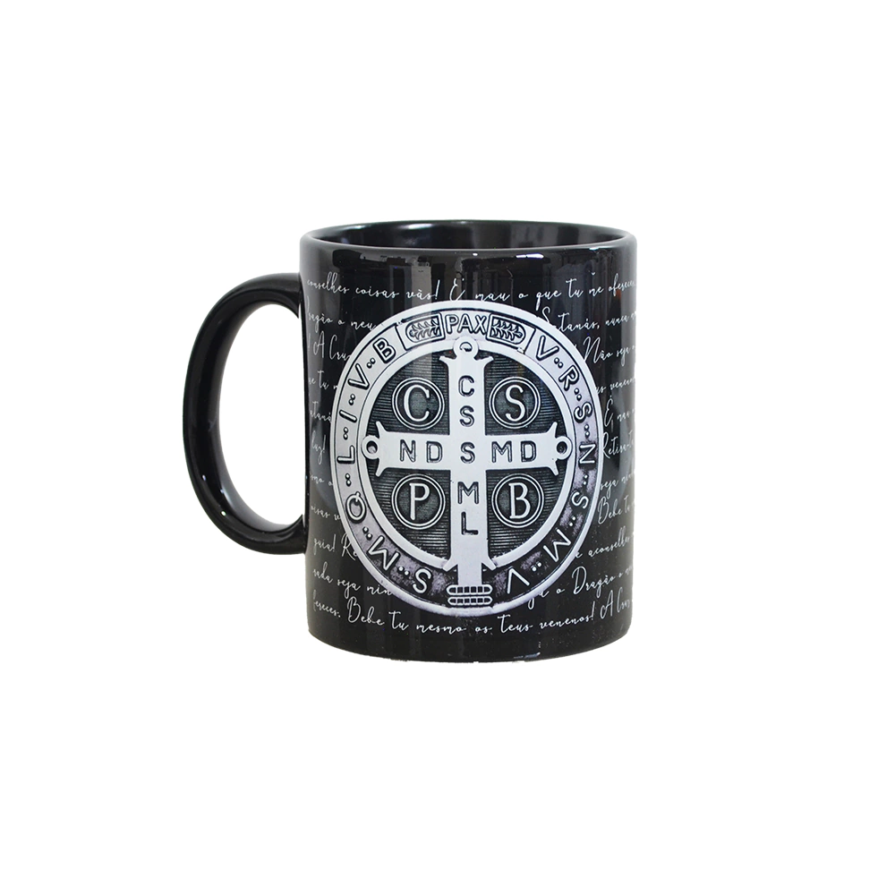 A caneca de São Bento é confeccionada com cerâmica na cor preta e possui a imagem da medalha de São Bento gravada na caneca. Atrás da imagem, possui gravada a oração de São Bento. É uma ótima forma de reforçar sua devoção ou de presentear uma pessoa querida.