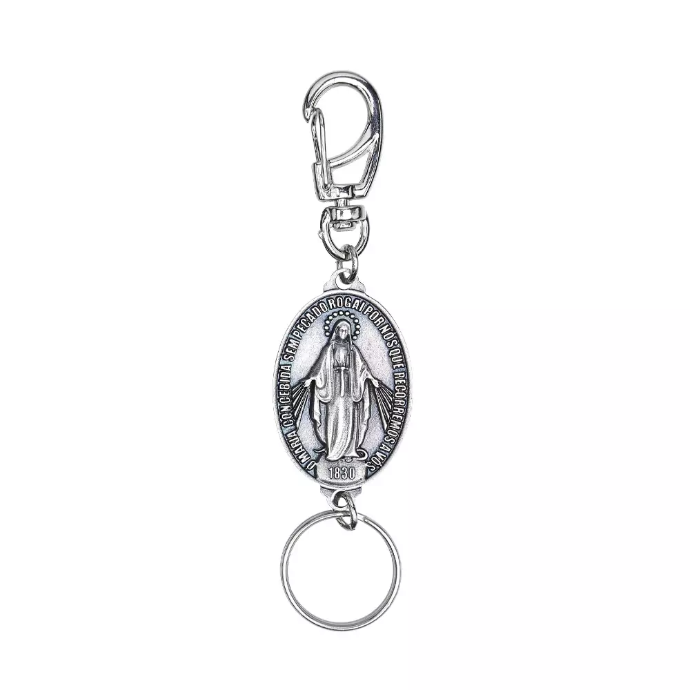 O chaveiro da Medalha Milagrosa de Nossa Senhora das Graças é inteiramente confeccionado em metal com acabamento na cor prateada. A Medalha Milagrosa possui os dizeres "Ó Maria concebida sem pecado, rogai por nós que recorremos a vós", tal qual recomendado por Nossa Senhora à Santa Catarina Labouré.