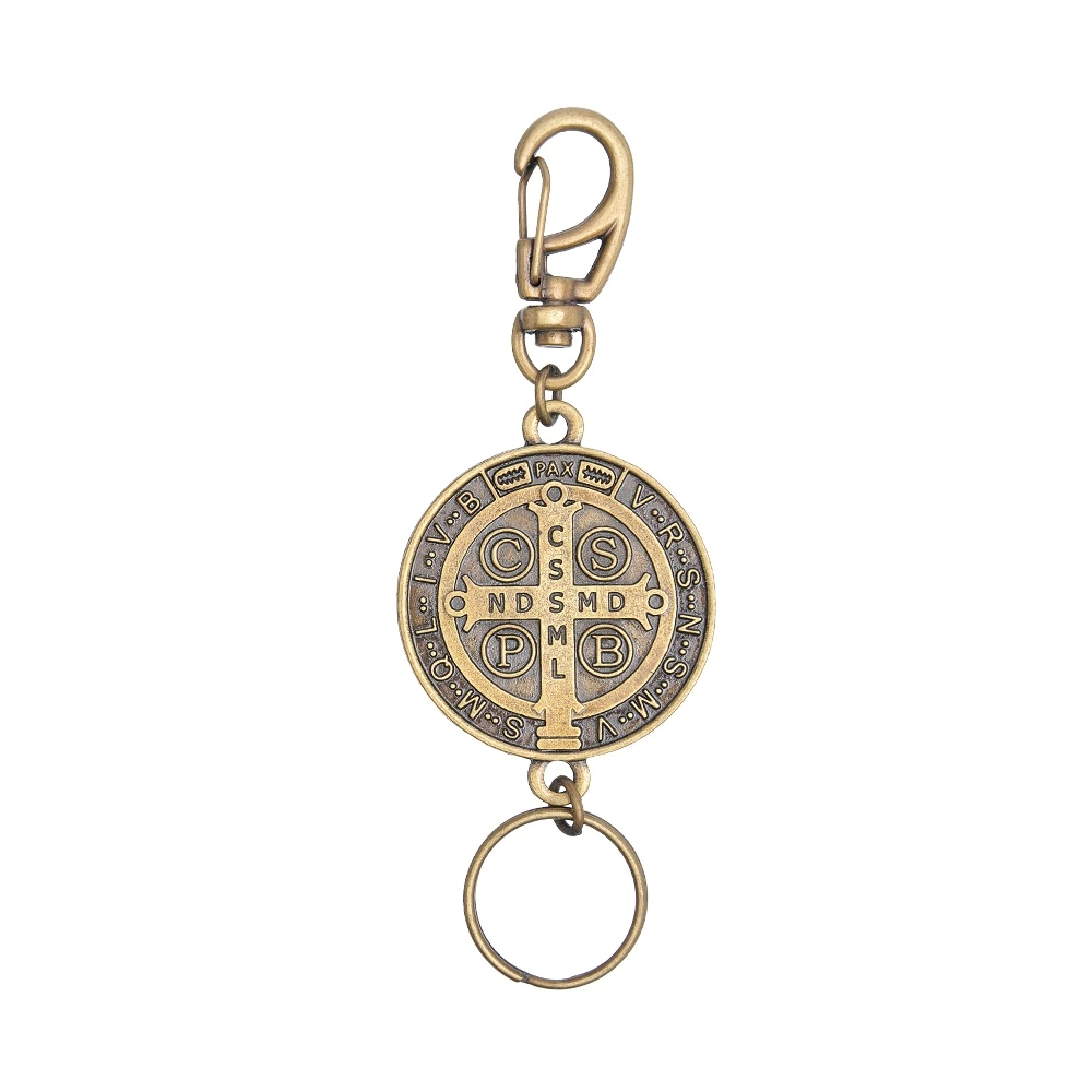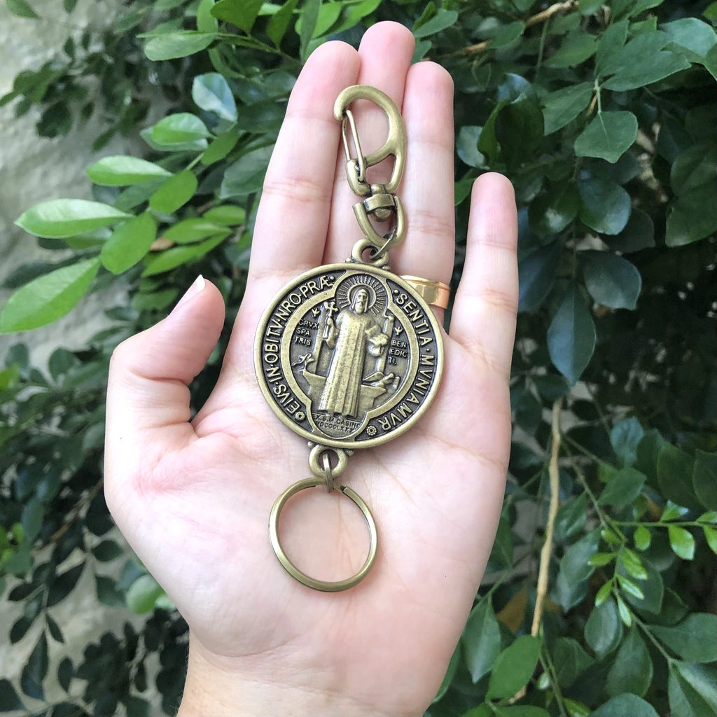 O chaveiro da Medalha de São Bento é inteiramente confeccionado em metal com acabamento ouro velho. Possui além da argola para chaves, o fecho mosquete.