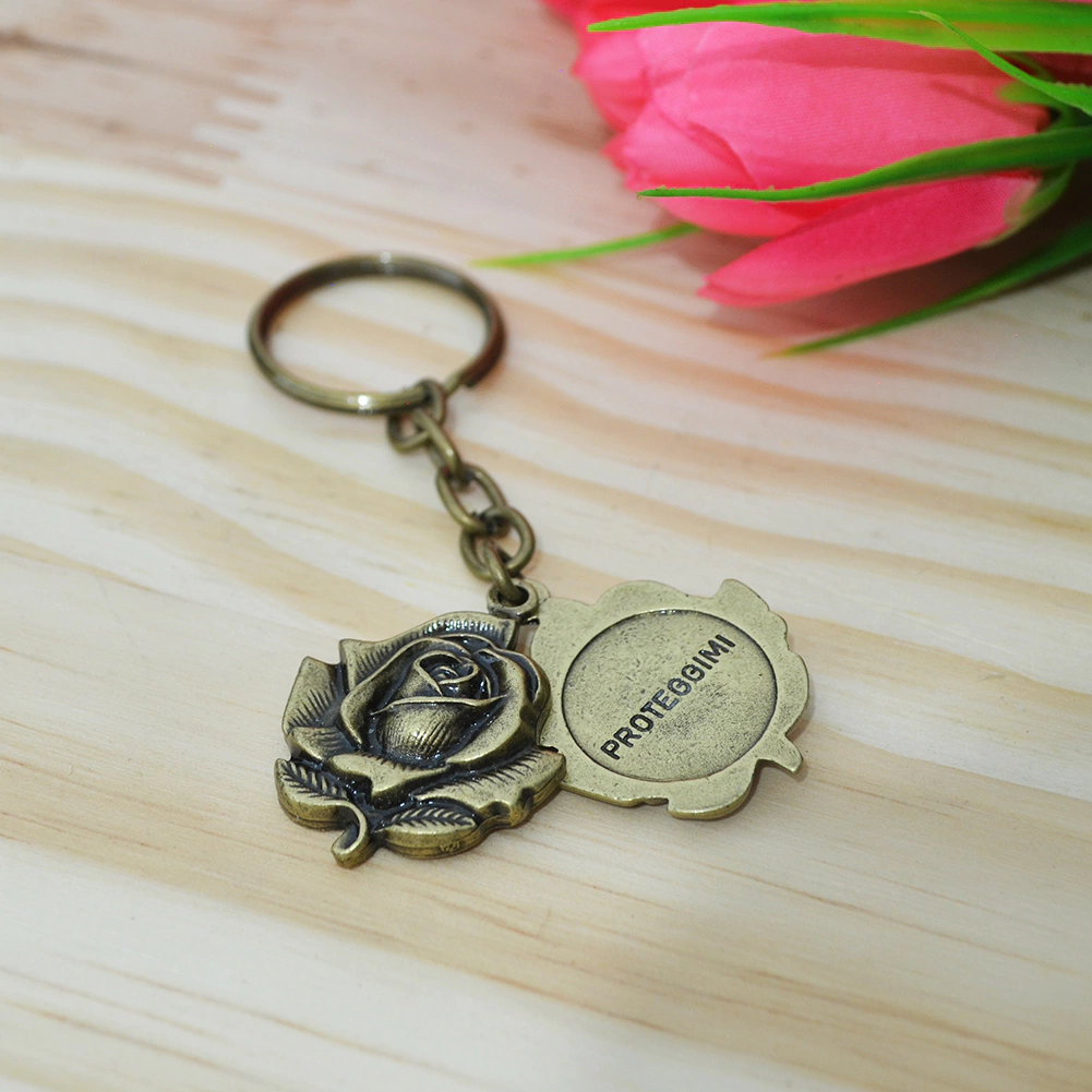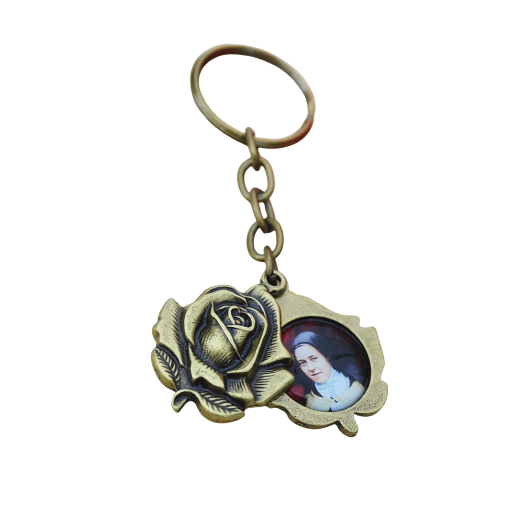 O Chaveiro Rosa de Santa Terezinha é confeccionado em metal na cor ouro velho. Ele possui duas faces de uma rosa, no verso de uma delas, possui a foto de Santa Terezinha e no verso da outra rosa, possui a palavra: "Proteggimi". Um chaveiro perfeito para demonstrar sua devoção ou presentear uma pessoa especial devota de Santa Terezinha.