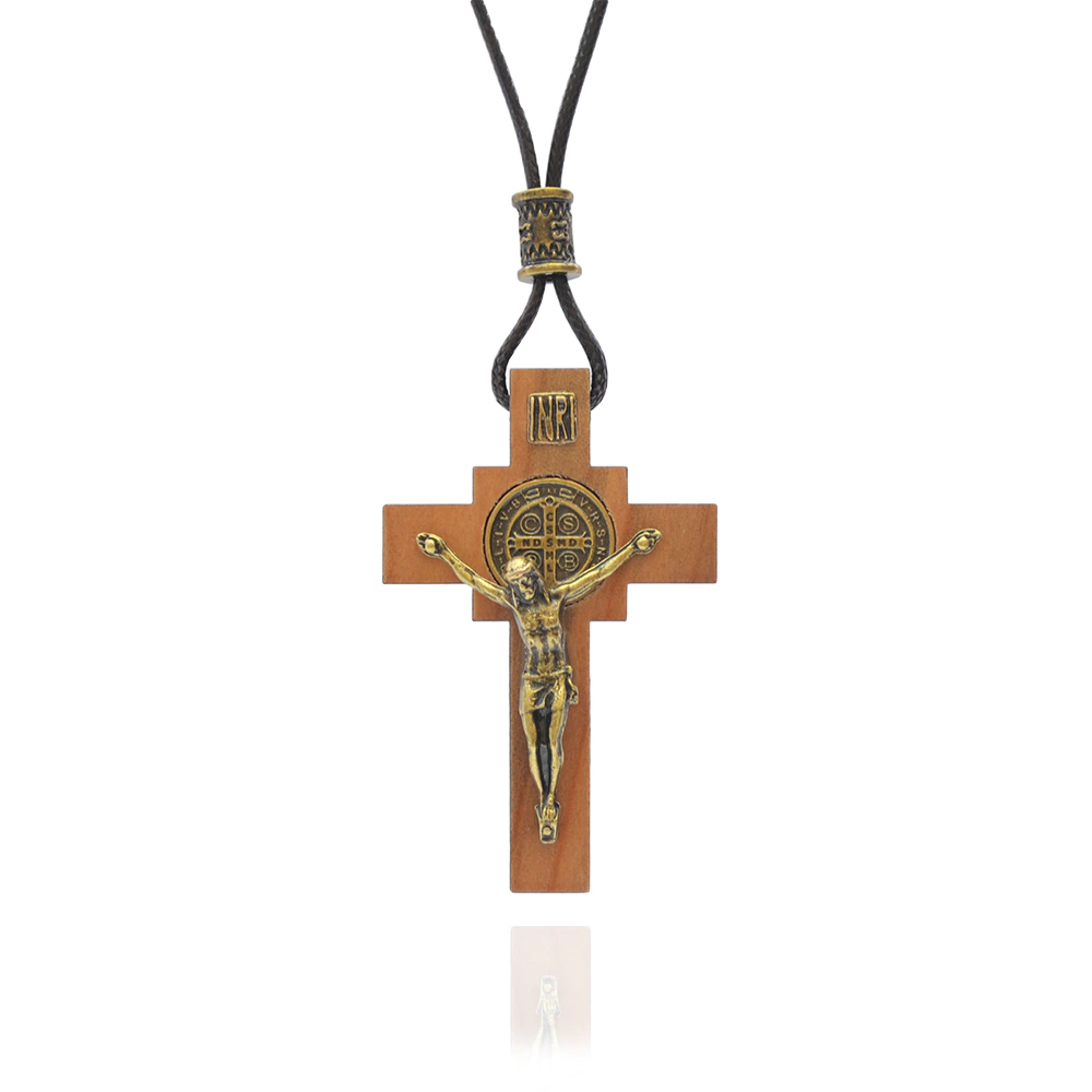 O Colar Crucifixo 7cm é confeccionado com cordão ajustável encerado na cor marrom e Crucifixo em madeira com metais em acabamento ouro velho. Possui a Medalha de São Bento cravada na frente e no verso.
