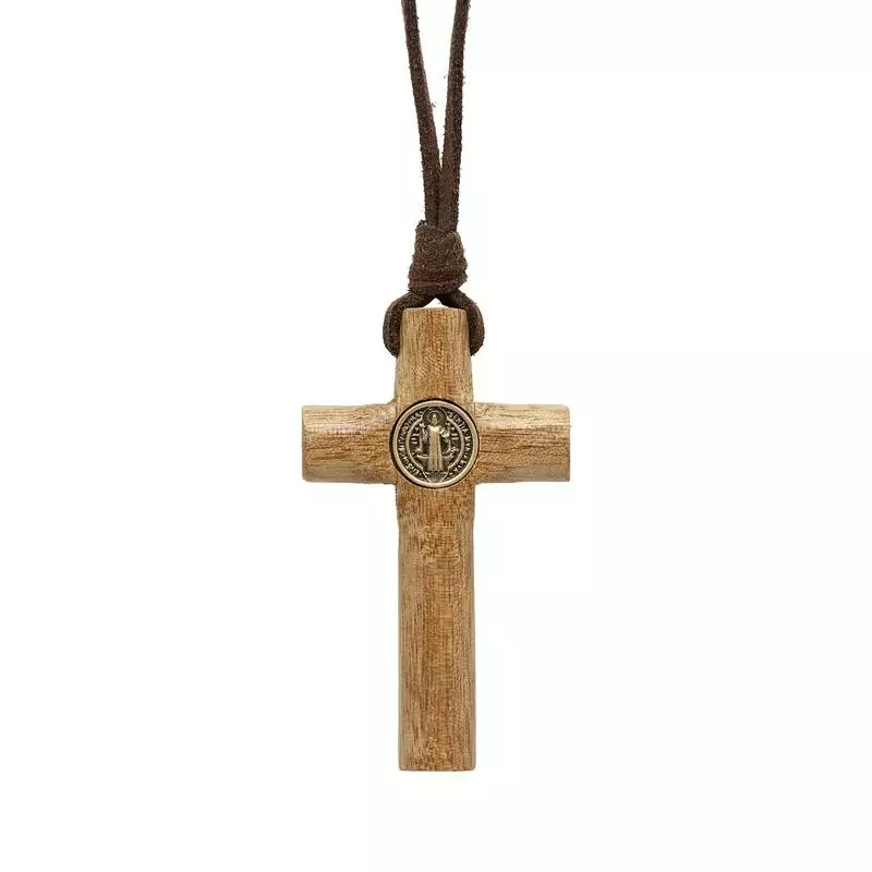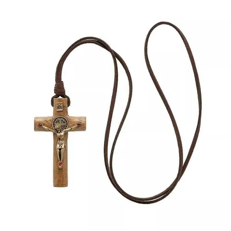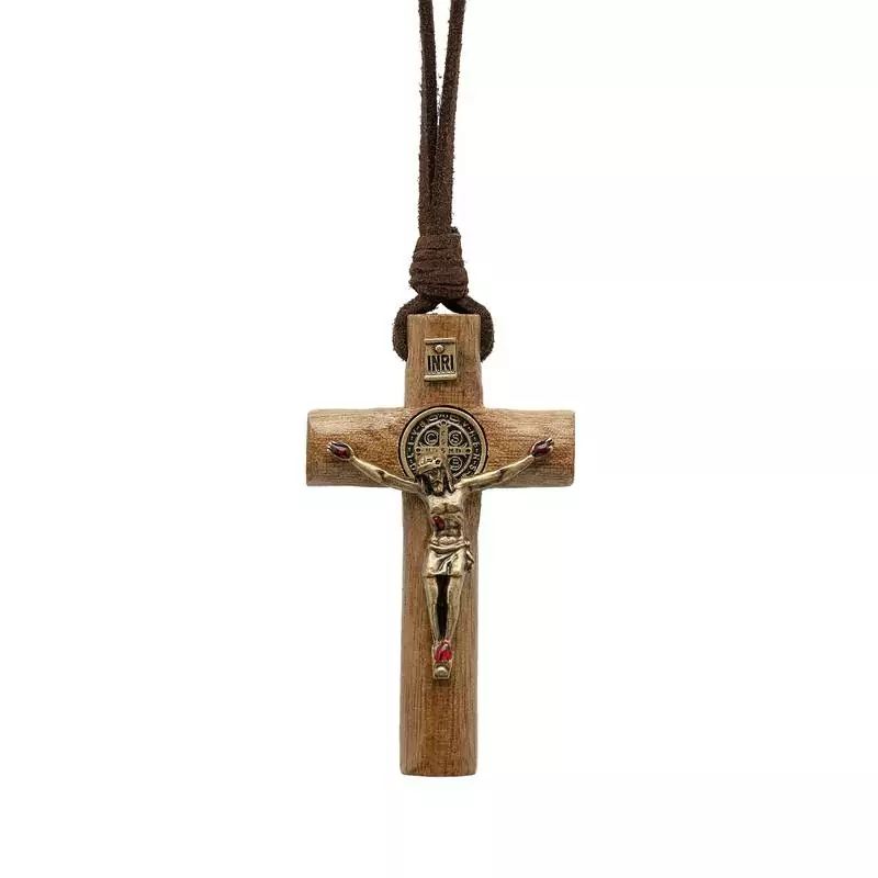 O colar Crucifixo Chagas de Cristo com São Bento possui cordão feito em couro e crucifixo em madeira com detalhes em metal com acabamento ouro velho. O crucifixo possui o detalhe das chagas de Nosso Senhor Jesus Cristo e a medalha de São Bento, na frente e no verso.