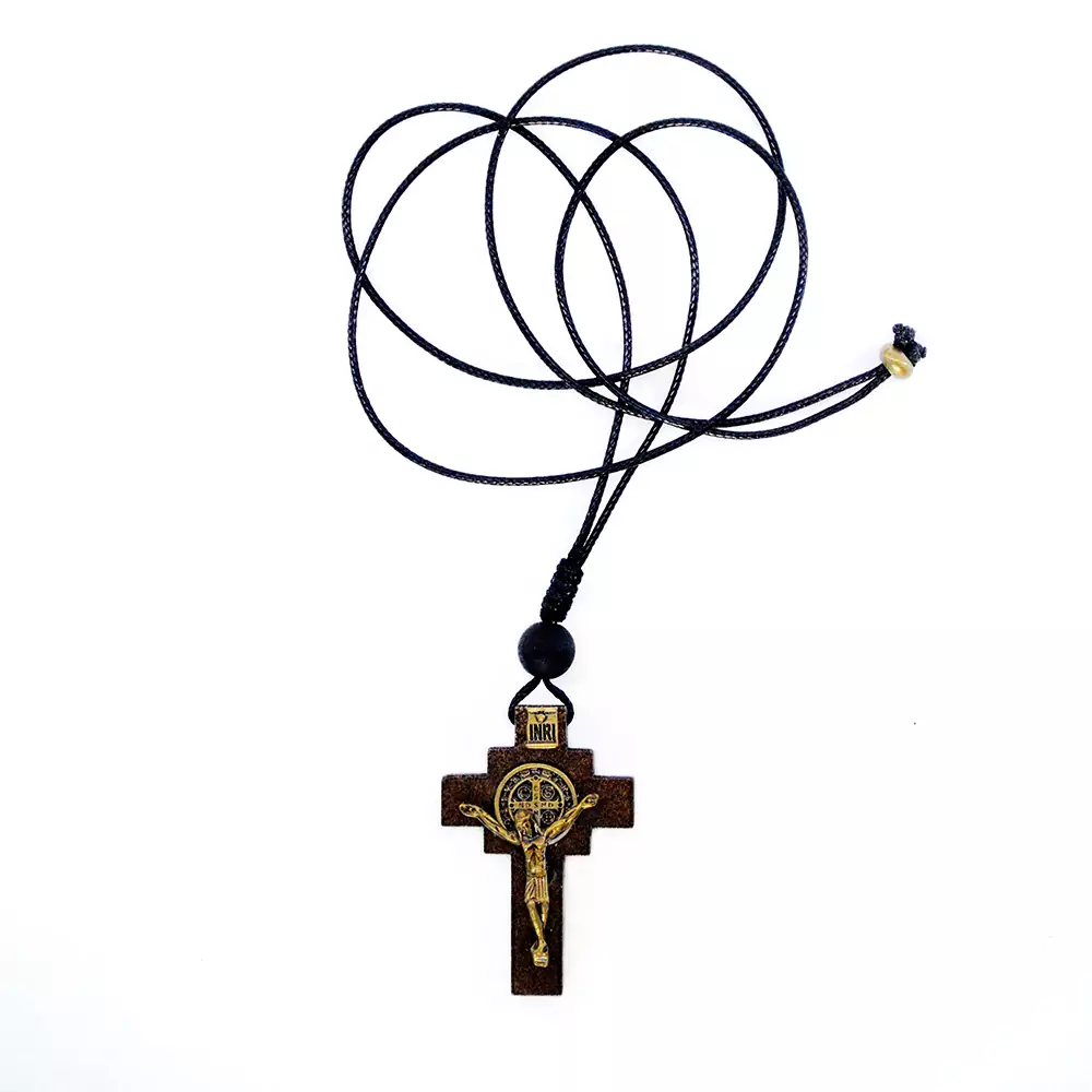 O colar Crucifixo São Bento pequeno possui crucifixo em madeira com detalhes em metal com acabamento ouro velho. O crucifixo possui a medalha de São Bento cravada na frente e no verso.