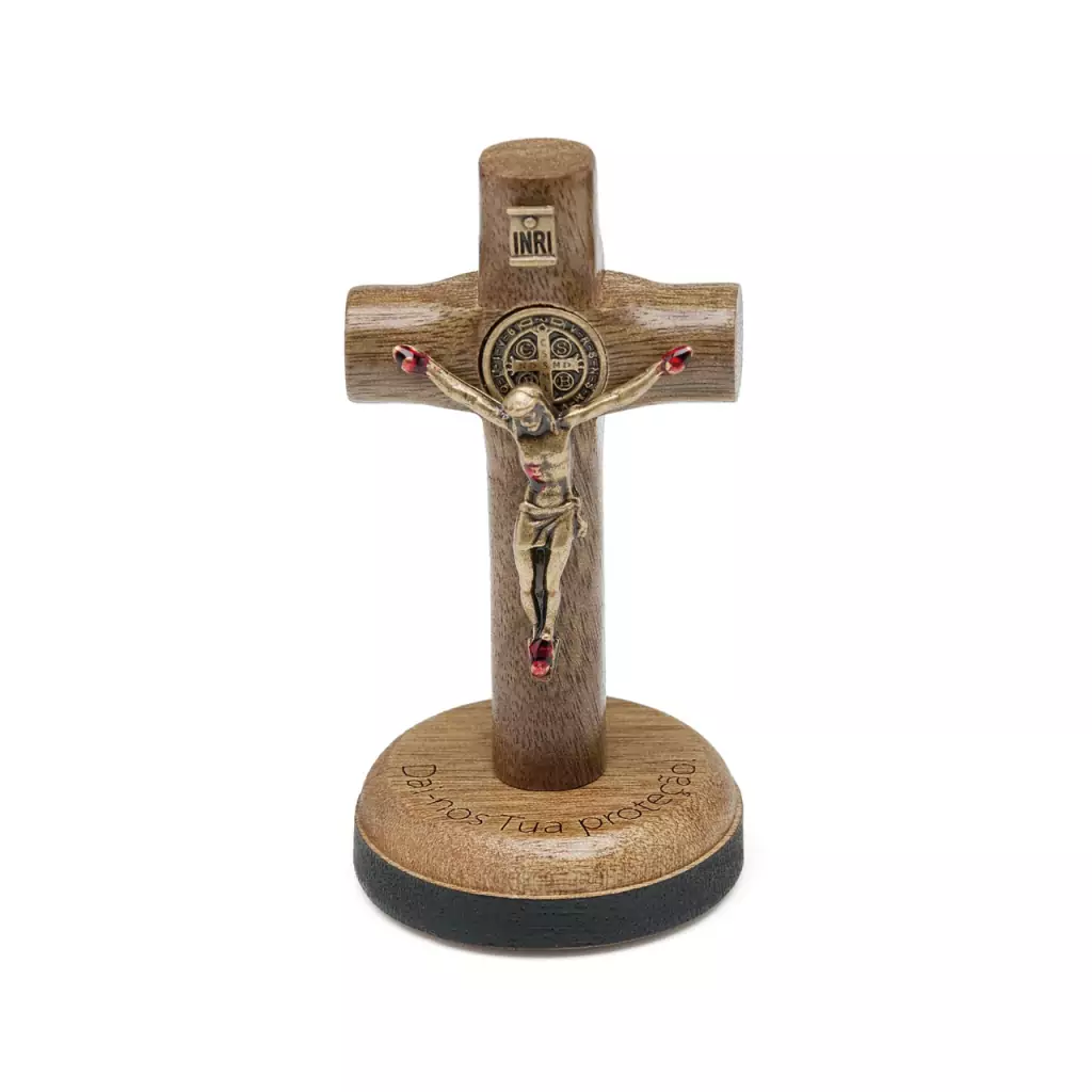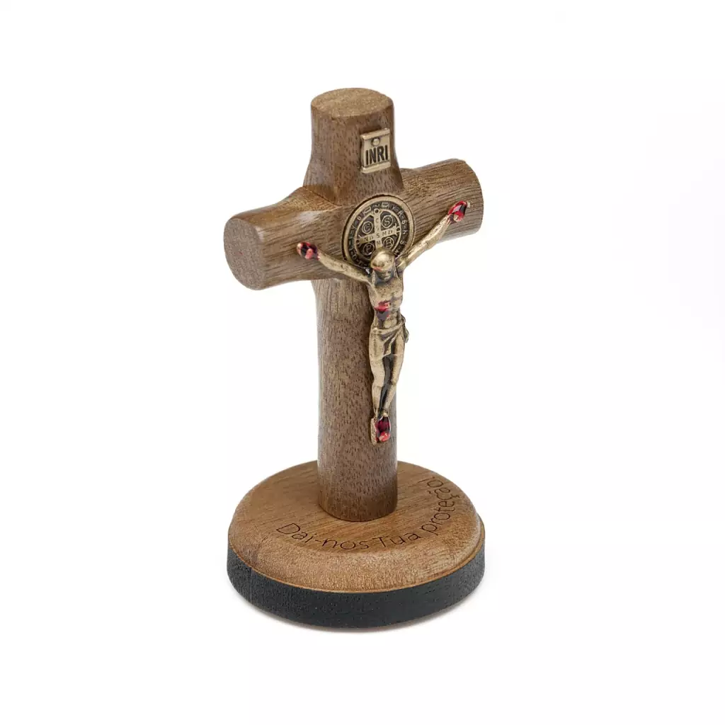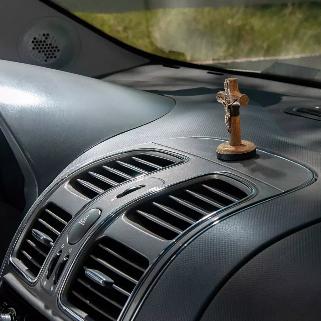 O Crucifixo é confeccionado em madeira, metais na cor ouro velho e possui os detalhes das Chagas de Cristo. Possui também a Medalha de São Bento cravada. Na sua base tem escrito: "Dai-nos tua proteção". É especial para ser fixado no painel do carro, possuindo embaixo da base possui uma fita colante para fixação.