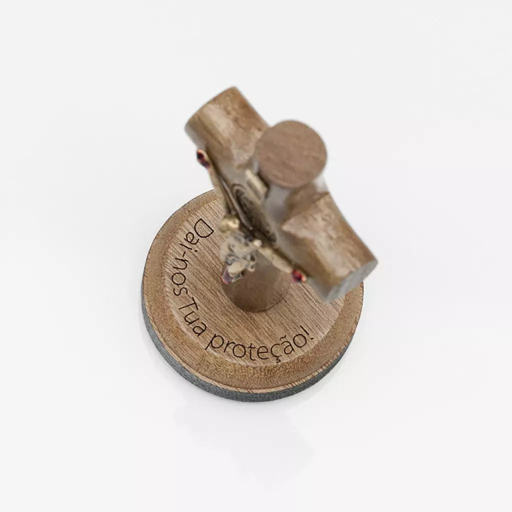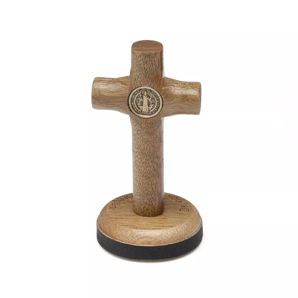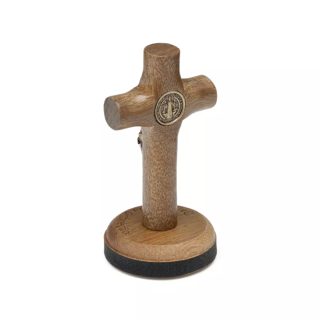 O Crucifixo é confeccionado em madeira, metais na cor ouro velho e possui os detalhes das Chagas de Cristo. Possui também a Medalha de São Bento cravada. Na sua base tem escrito: "Dai-nos tua proteção". É especial para ser fixado no painel do carro, possuindo embaixo da base possui uma fita colante para fixação.