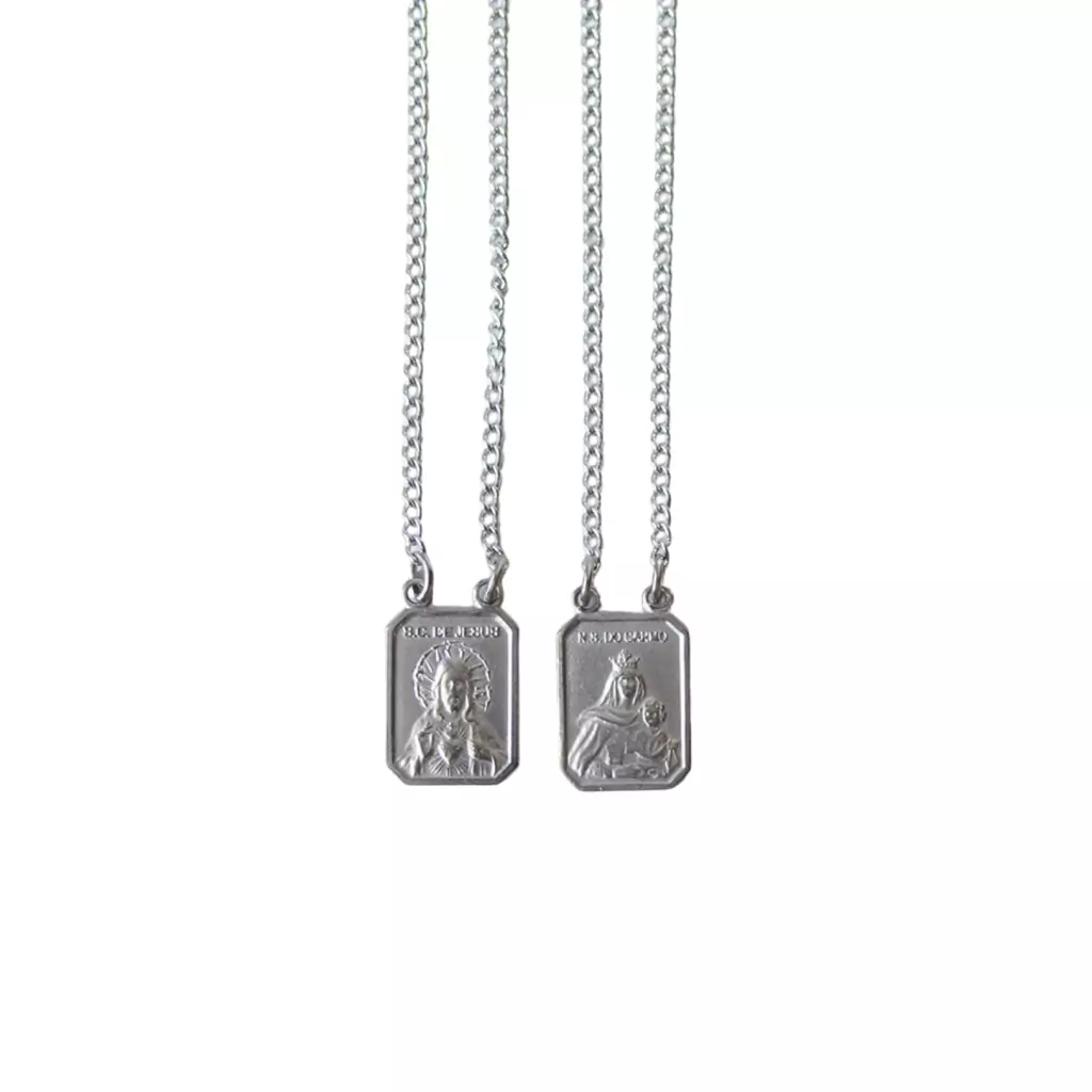 O uso do escapulário é uma das principais devoções marianas. Consta na tradição que, no dia 16 de julho de 1251, a própria Virgem Maria entregou a S. Simão Stock, dizendo estas palavras: "Filho querido, recebe este escapulário de tua Ordem, sinal de minha amizade fraterna, privilégio para ti e para todos os Carmelitas. Aqueles que morrerem revestidos com ele não padecerão o fogo do inferno. É um sinal de salvação, amparo e proteção nos perigos e aliança de paz para sempre". A segunda promessa de Nossa Senhora foi feita ao Papa João Paulo XXIII. Referindo-se aos que usarem o ecapulário durante sua vida, diz o seguinte: Eu, Mãe bondosa, descerei no primeiro sábado após sua morte, e a quantos achar no purgatório livrarei e levarei ao monte santo da vida eterna". O próprio Papa confirmou com indulgência plenária, em favor daqueles que usarem sempre o escapulário. O Escapulário retangular com efeito fosco possui a imagem de Nossa Senhora do Carmo em uma extremidade e na outra de Jesus. É confeccionado em aço inoxidável e por isso não oxida, nem descasca.