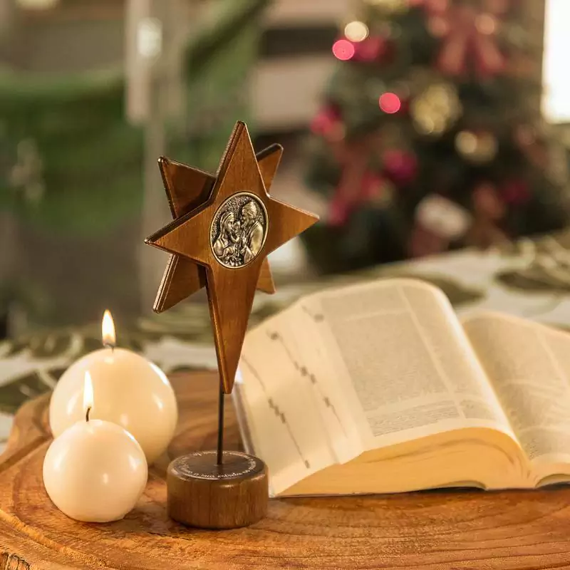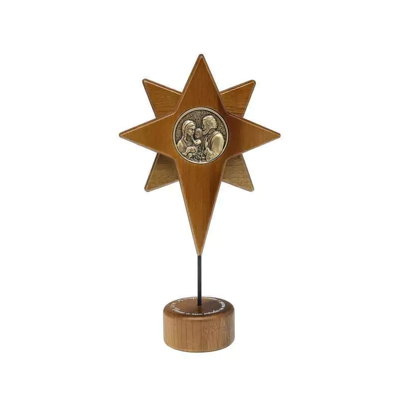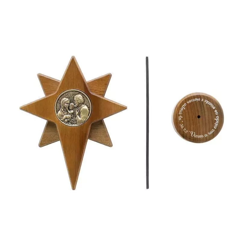 Cena Sagrada: Na Estrela de Belém, a imagem da Sagrada Família, cuidadosamente gravada, torna-se o ponto focal, encapsulando a beleza do nascimento de Jesus.