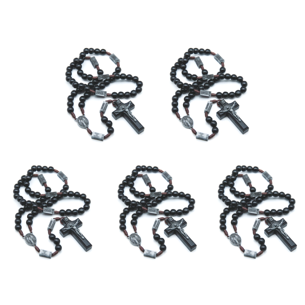 O kit é composto por 5 unidades do terço da Contemplação dos Mistérios. Confeccionado com contas em madeira imbuia de 10 mm na cor preta e metais com acabamento ônix. As contas do Pai Nosso são em metal e informam qual o mistério do dia e a sequência das contemplações dentro de cada mistério. Em um único terço, você possui as informações dos 4 mistérios, para que possa contemplá-los corretamente. No entremeio, encontra-se a Medalha Milagrosa de Nossa Senhora das Graças e no crucifixo encontra-se a medalha de São Bento cravada na frente e no verso.