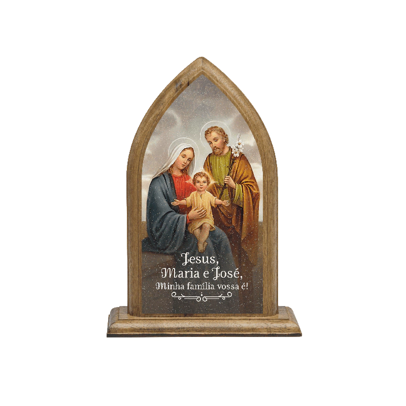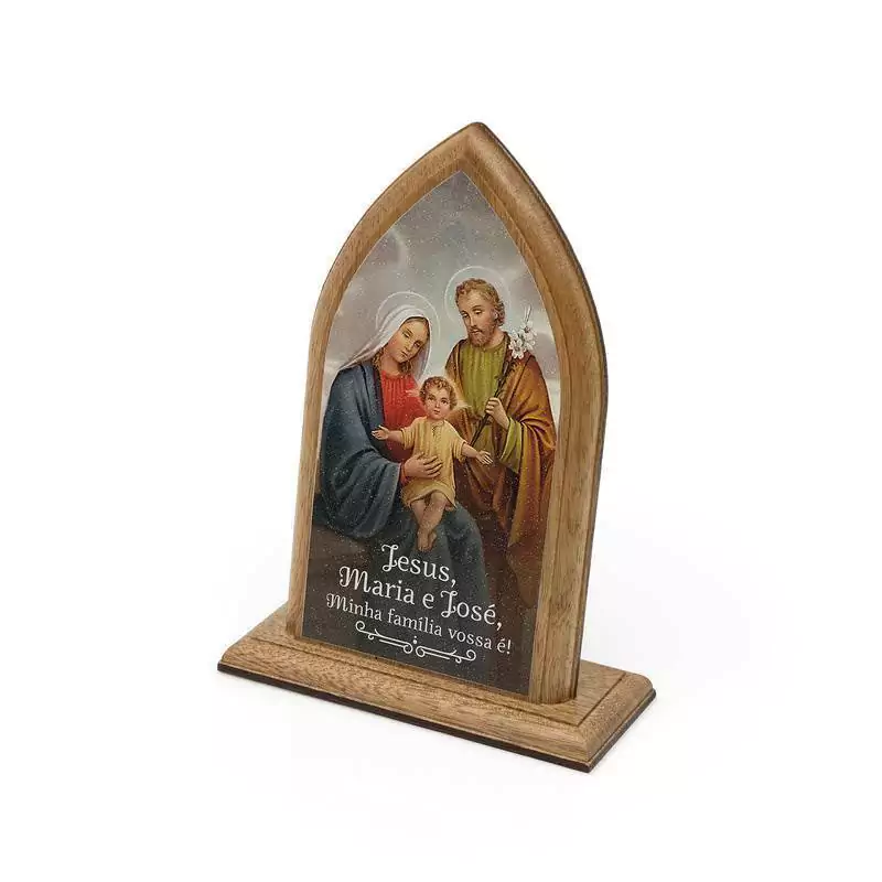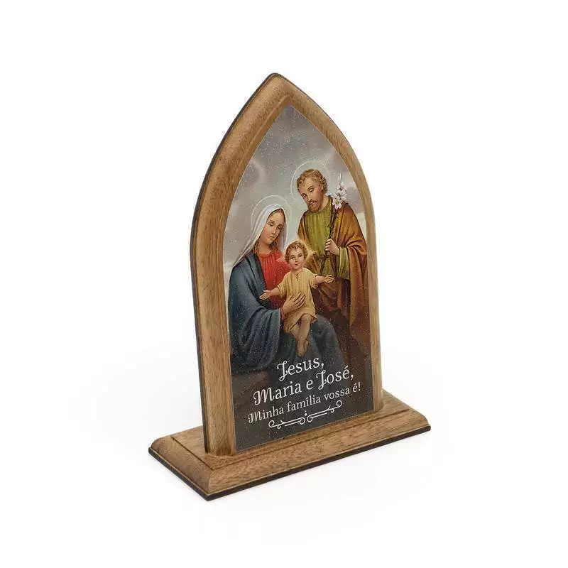 O Oratório da Sagrada Família é confeccionado em madeira com a imagem de da Sagrada Família de Nazaré com detalhes brilhosos adesivadas e os dizeres "Jesus, Maria e José, minha família vossa é!" na parte inferior da imagem. Perfeito para colocar em oratórios, mesas, escritórios, cabeceiras, estantes ou para presentear alguém especial.