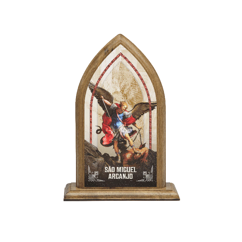 O Oratório de São Miguel Arcanjo é confeccionado em madeira com a imagem de São Miguel com detalhes brilhosos adesivadas. Perfeito para colocar em oratórios, mesas, escritórios, cabeceiras e estantes.