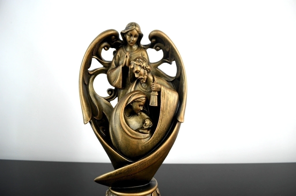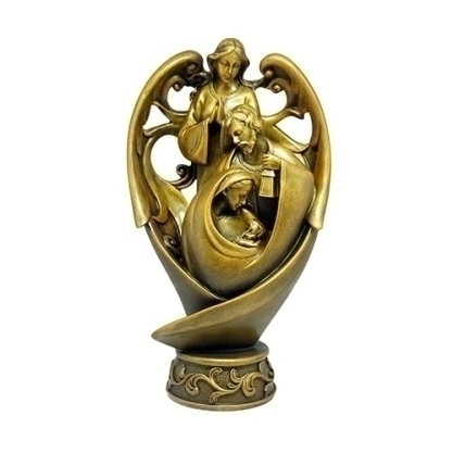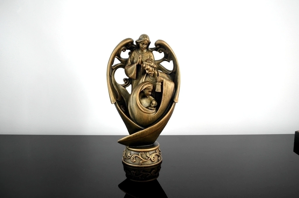 A imagem Presépio da Sagrada Família em é confeccionado em mármore maciço na cor bronze. Possui um anjo envolvendo a Sagrada Família. É uma imagem com um fino acabamento, rica em detalhes e com alta resistência e durabilidade. Imagem com 30 centímetros de altura.