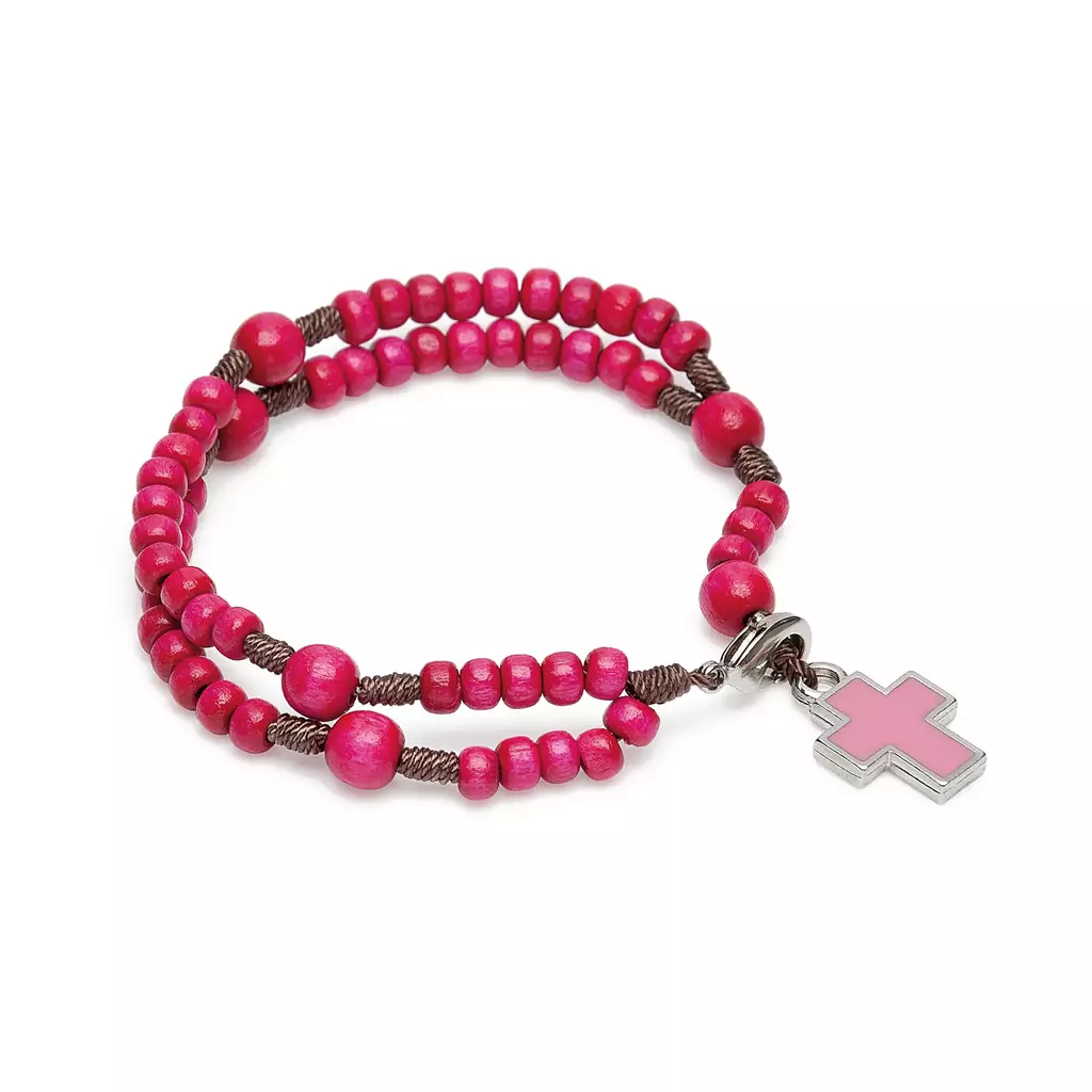 Possui contas em madeira de 4mm e 6 mm na cor Rosa e a medalha do Crucifixo na cor rosa. É regulável, ajustando-se a diversos tamanhos de pulsos.