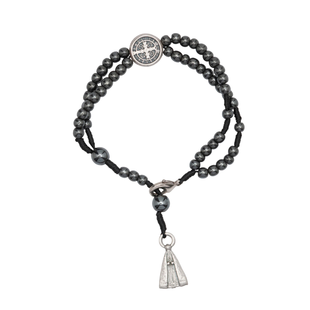 Pulseira Terço em Hematita com medalha de São Bento e pingente de Nossa Senhora Aparecida