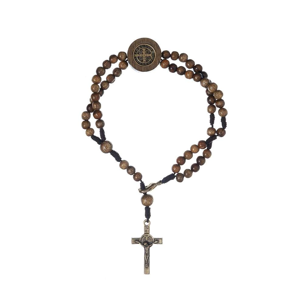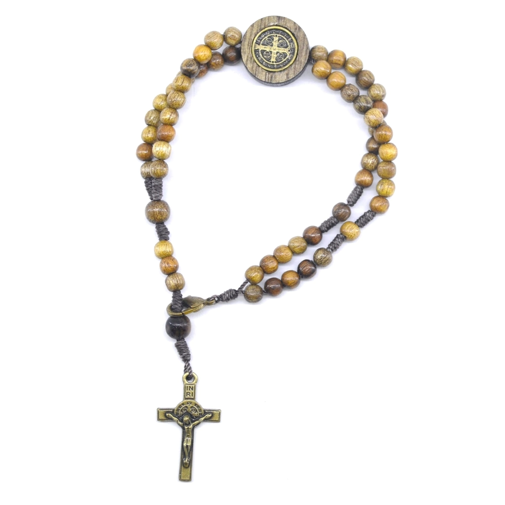 A pulseira terço é confeccionada em madeira com contas de 4mm e 6mm e metais com acabamento ouro velho. Possui a medalha de São Bento feita em metal e com acabamento ouro velho no centro. É regulável, ajustando-se a diversos tamanhos de pulsos.