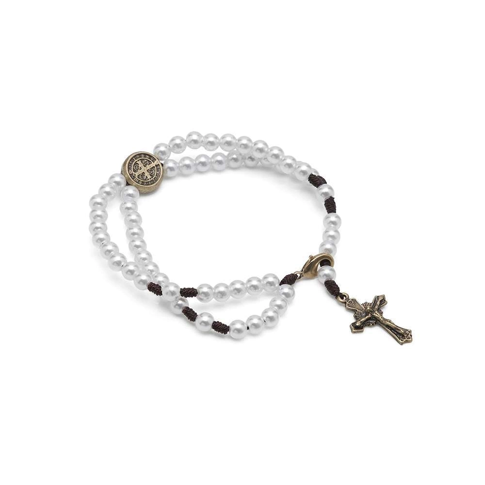 Pulseira terço confeccionada com contas em pérola branca de 5mm e metais com acabamento em ouro velho. No centro da pulseira encontra-se a medalha de São Bento. É regulável, ajustando-se a diversos tamanhos de pulsos.