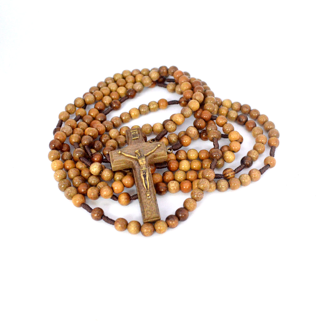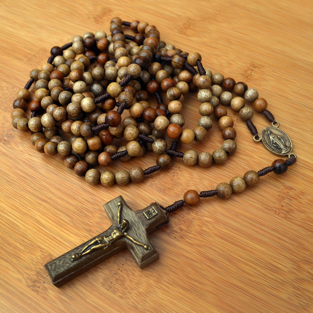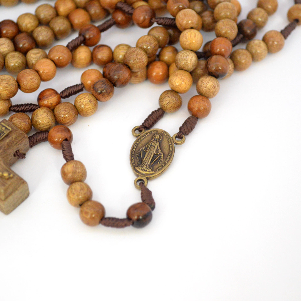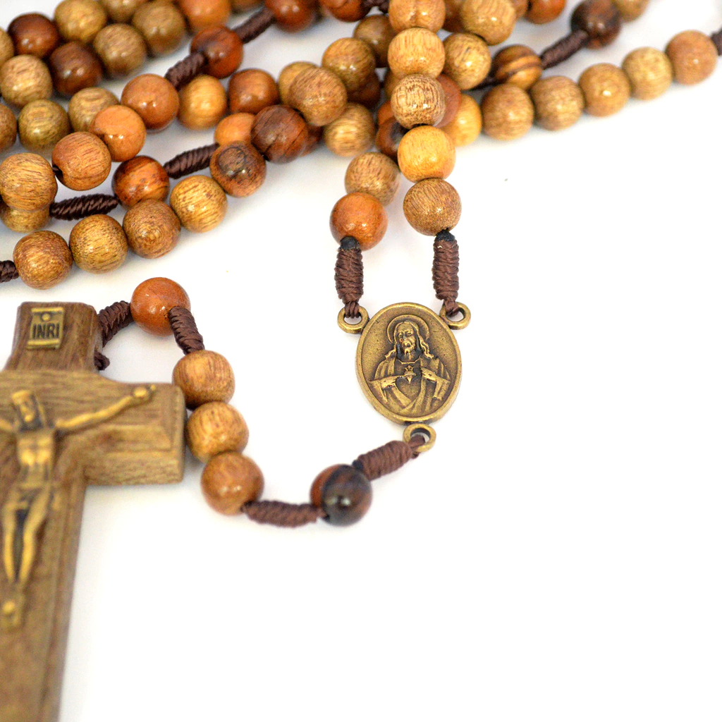 Rosário em Madeira imbuia com contas de 8mm. Possui metais com acabemento em ouro velho. O entremeio possui a imagem do Sagrado Coração de Jesus na frente e a de Nossa Senhora das Graças no verso.