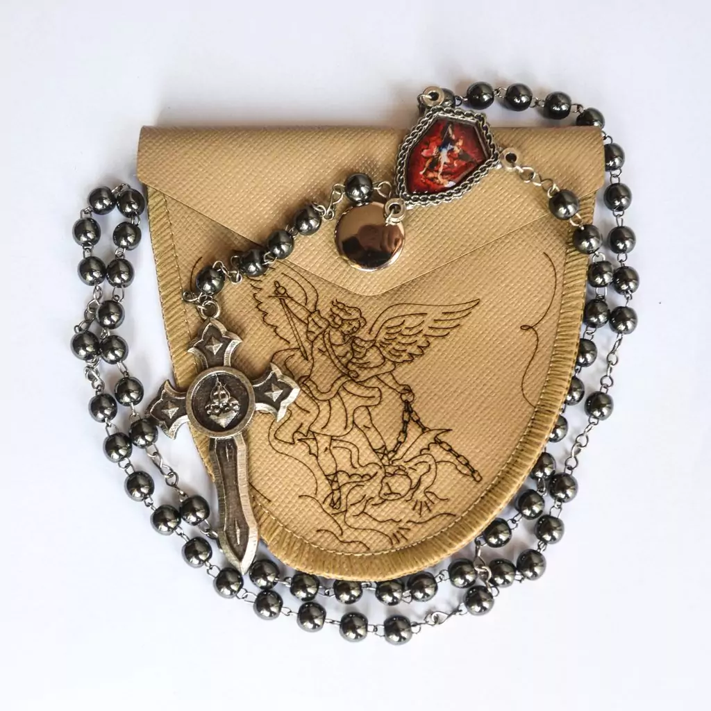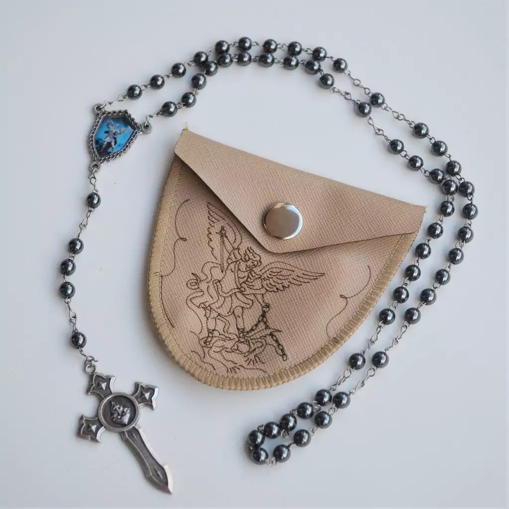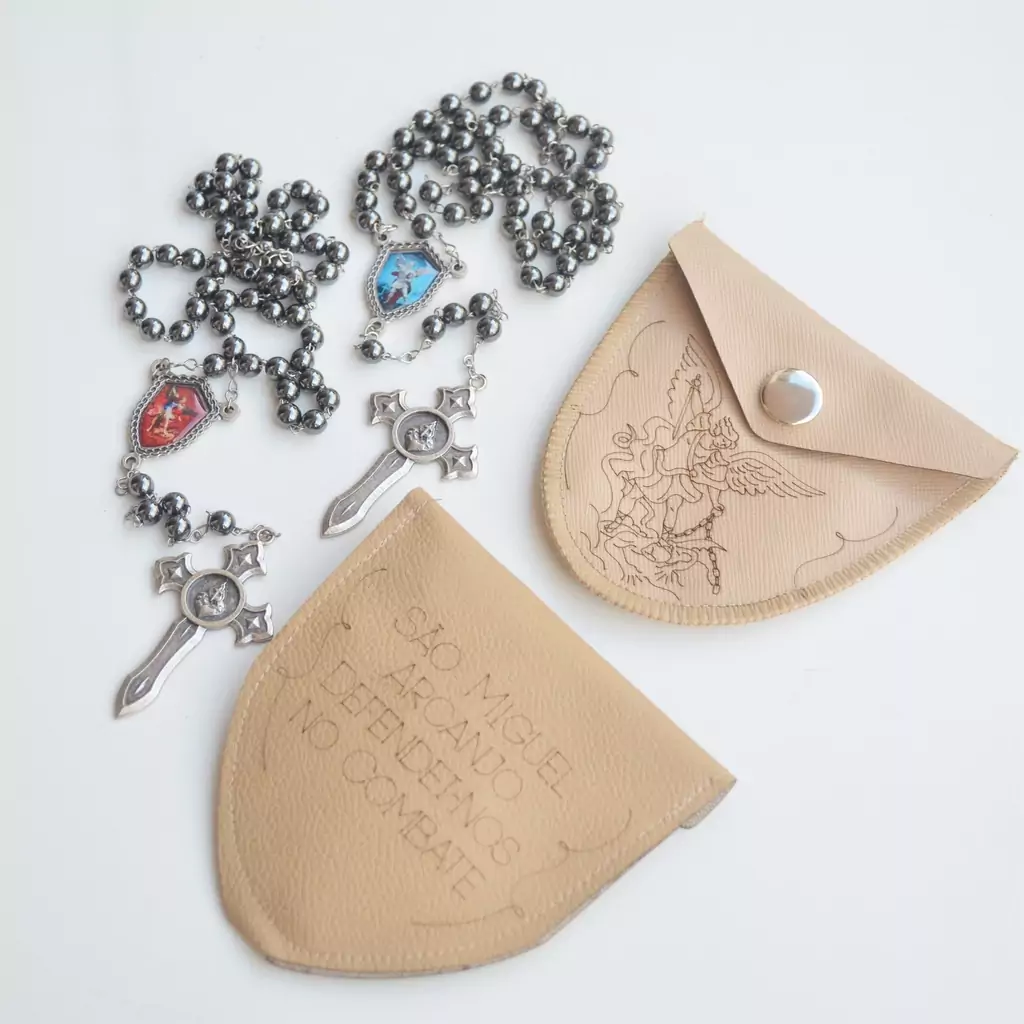 Acompanha porta-terço em couro sintético com gravação de imagem e frase de São Miguel.