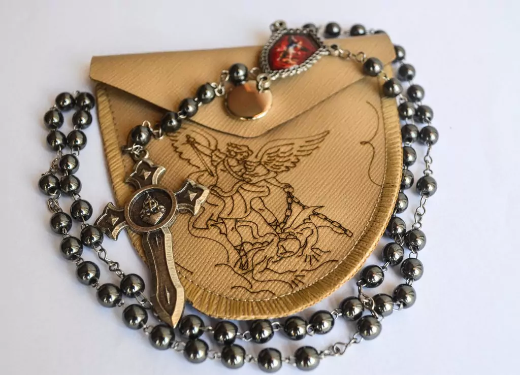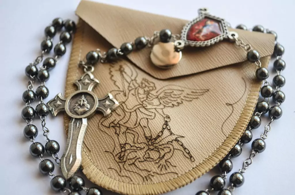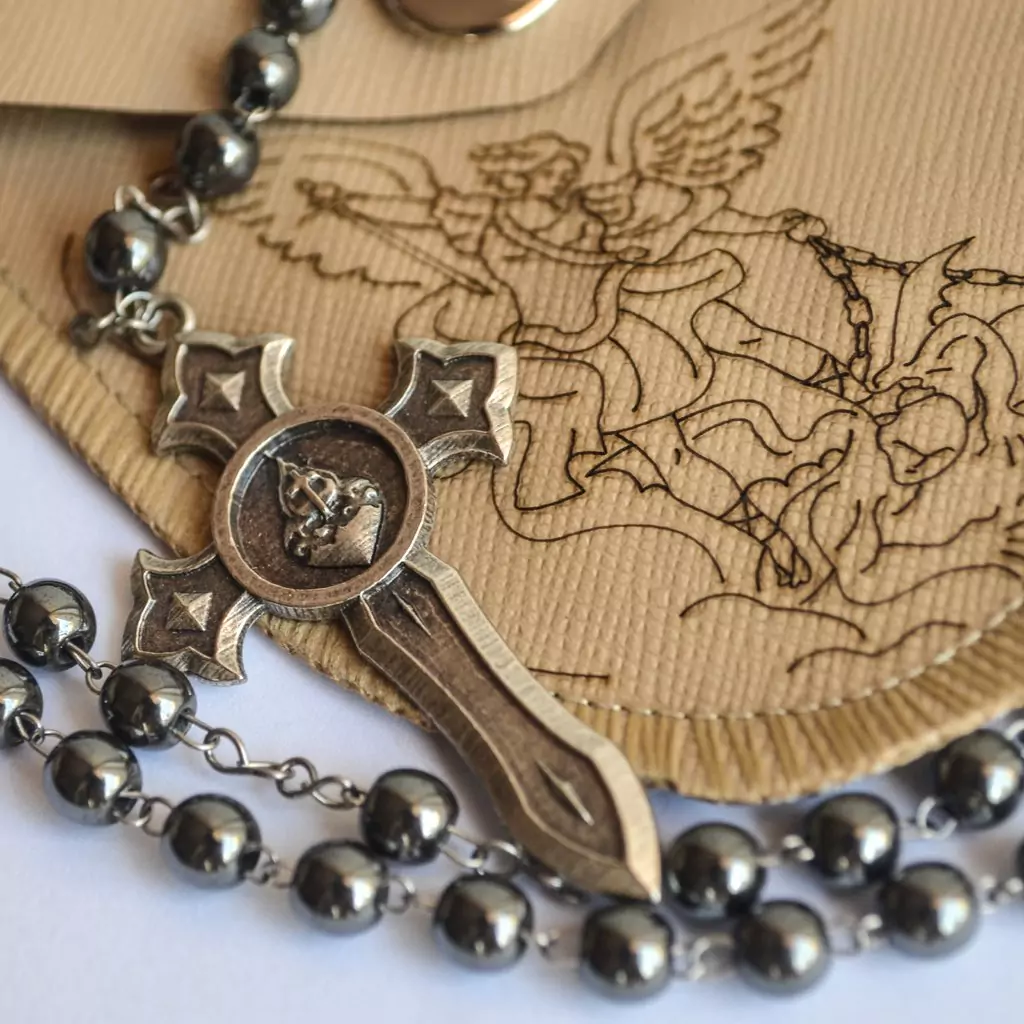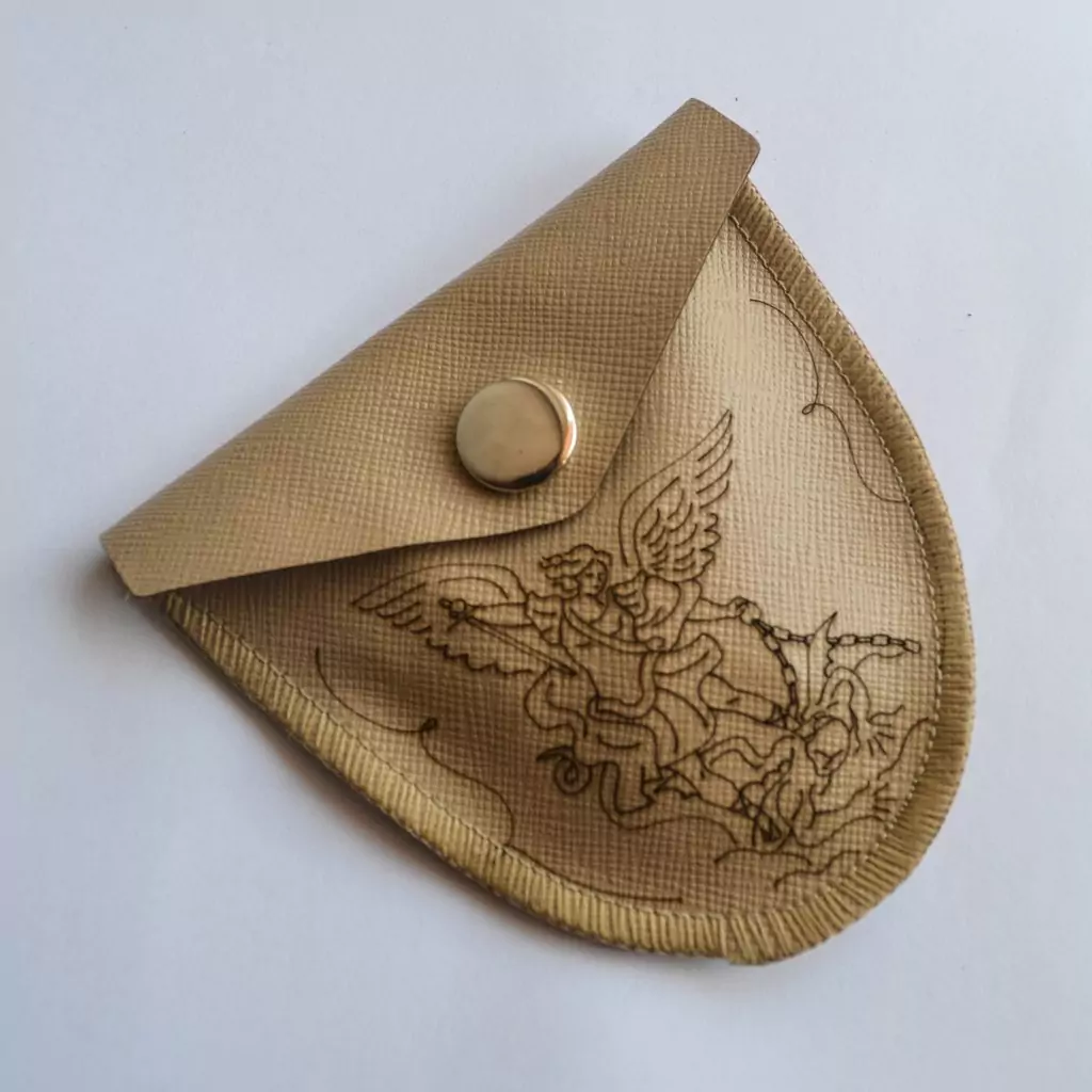 Acompanha porta-terço em couro sintético com gravação de imagem e frase de São Miguel.