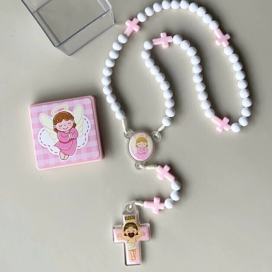 Feito com contas nas cores rosa e branca, transmite pureza e delicadeza, sendo ideal para momentos de oração em família, catequese ou como lembrança de batizado, primeira eucaristia ou nascimento. As contas do Pai Nosso são pequenas Cruzes e o entremeio é a imagem do Anjo da Guarda.