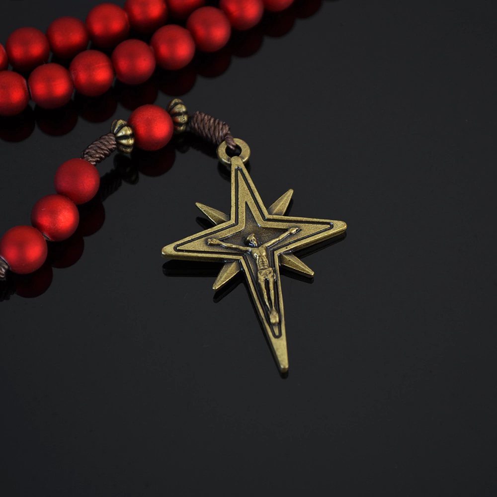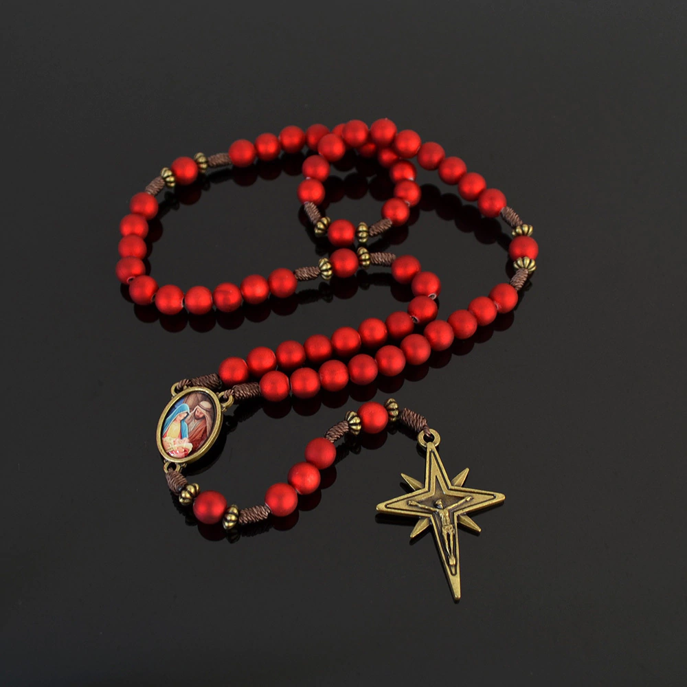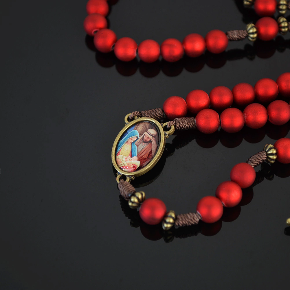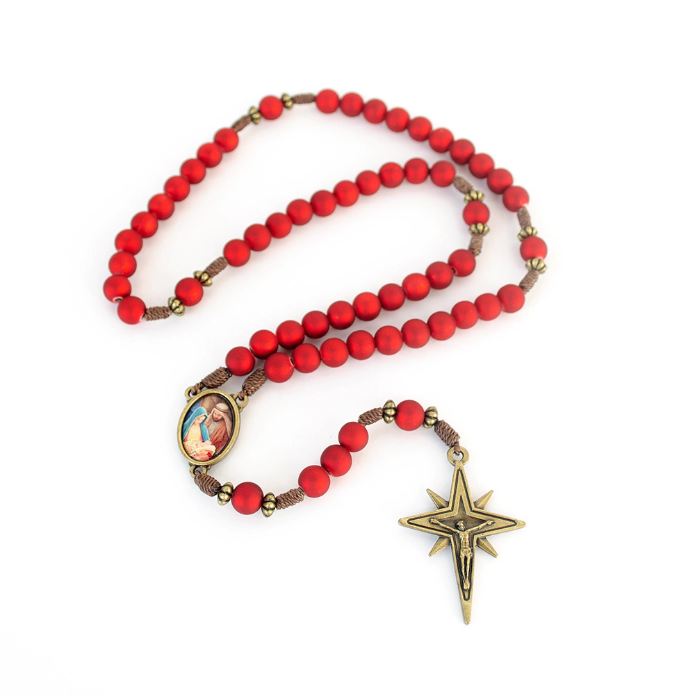 O Terço de Natal é confeccionado com contas em plástico metálico na cor vermelho fosco de tamanho 8mm. Possui o entremeio resinado com imagem da Sagrada Família. O Crucifixo possui o formato da estrela de Belém. É uma perfeita opção para presentear com significado no Natal, lembrando o nascimento do menino Jesus e a devoção ao Santo Rosário.