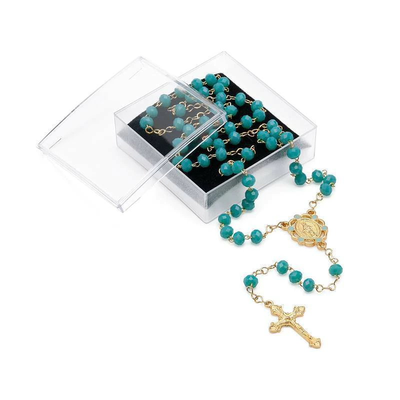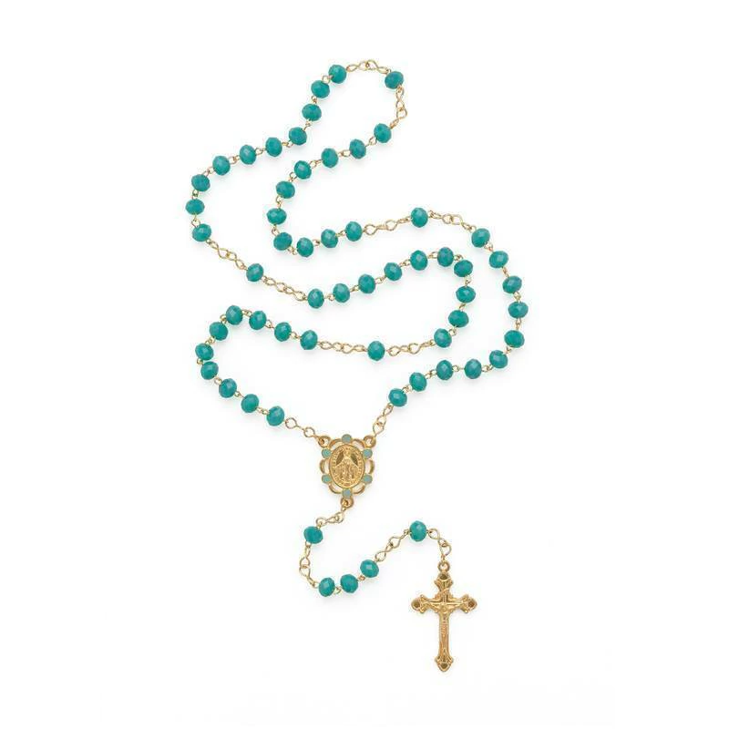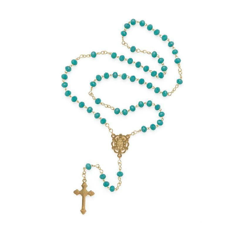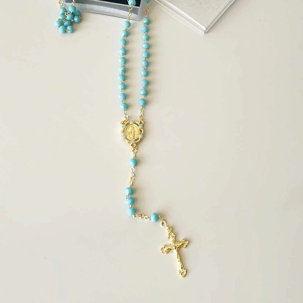 Cristais turquesas deslumbrantes: Cada conta do terço é uma conta reluzente de cristal turquesa.