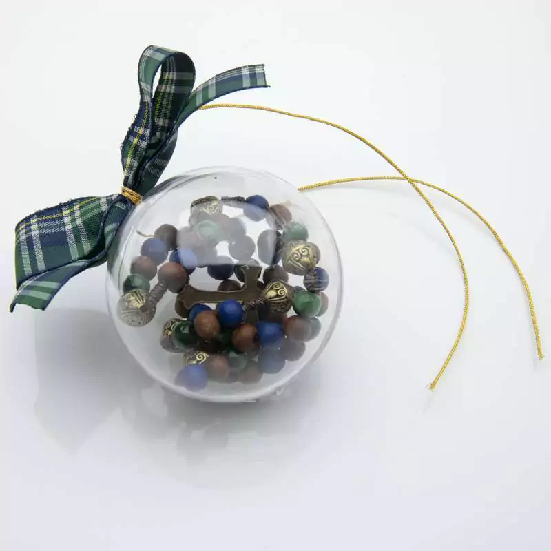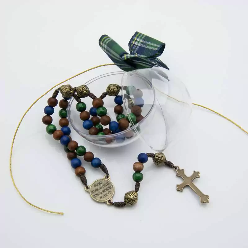 Este belíssimo terço é confeccionado com contas em madeira nas cores marrom, azul e verde e metais em tom ouro velho, trazendo um toque rústico e sofisticado. No entremeio, a imagem da Sagrada Família confere um significado especial e devocional a esta peça única. Acompanha uma delicada bola de natal decorativa transparente, adornada com um laço em estampa natalina, tornando-o uma opção ideal para presentear ou decorar sua árvore de Natal com fé e espiritualidade.