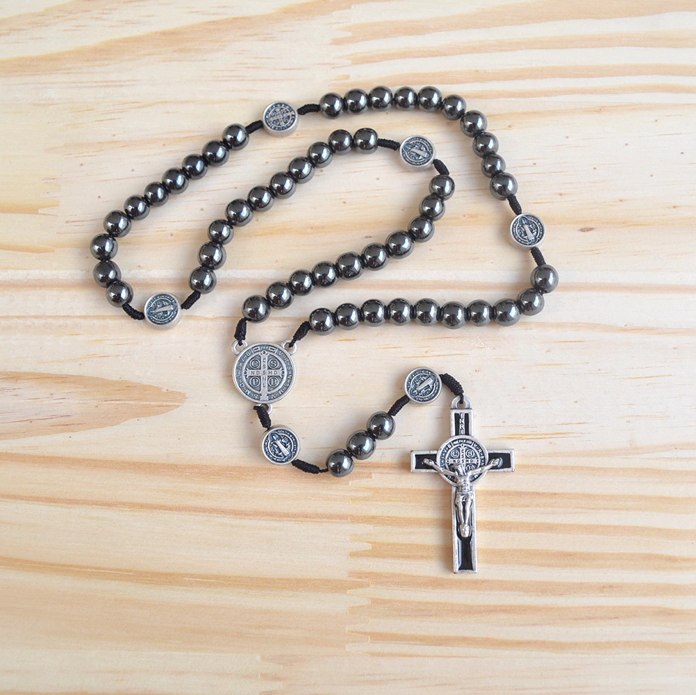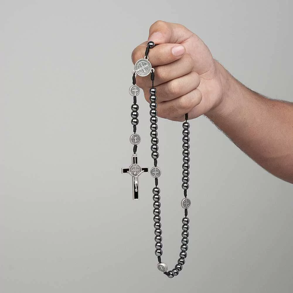 O terço de São Bento é confeccionado em corda e possui as contas em hematita 8mm. Possui a medalha de São Bento em metal nos entremeios e nas contas do Pai Nosso. O crucifixo do terço é inteiramente confeccionado em metal e possui detalhes resinados na cor preta. Todos os metais do terço possuem acabamento prata velha.