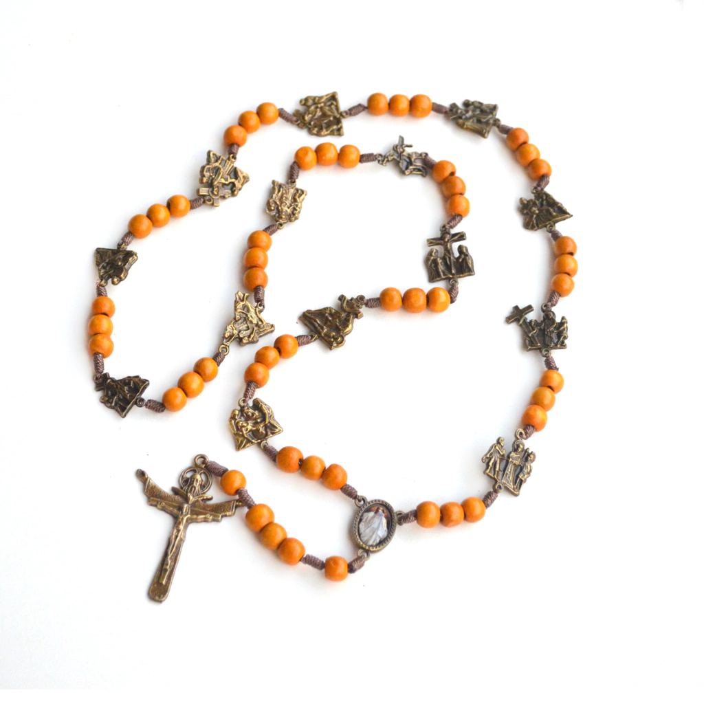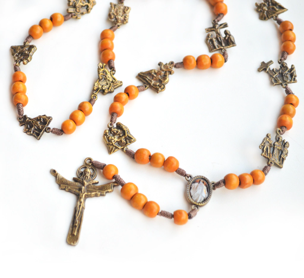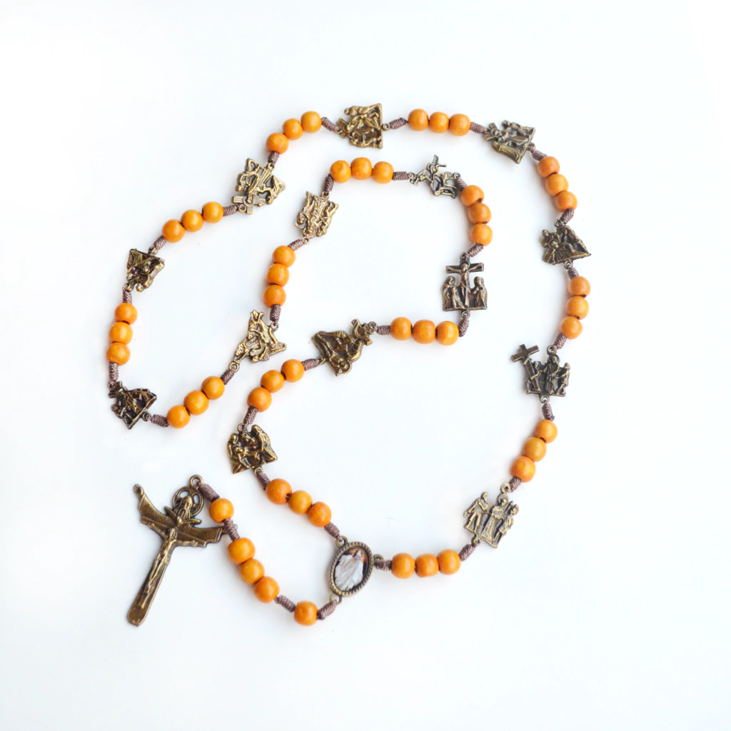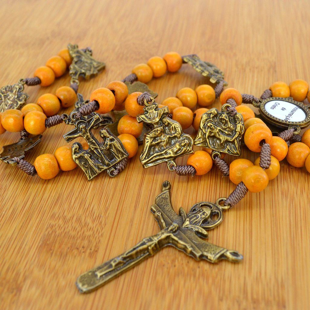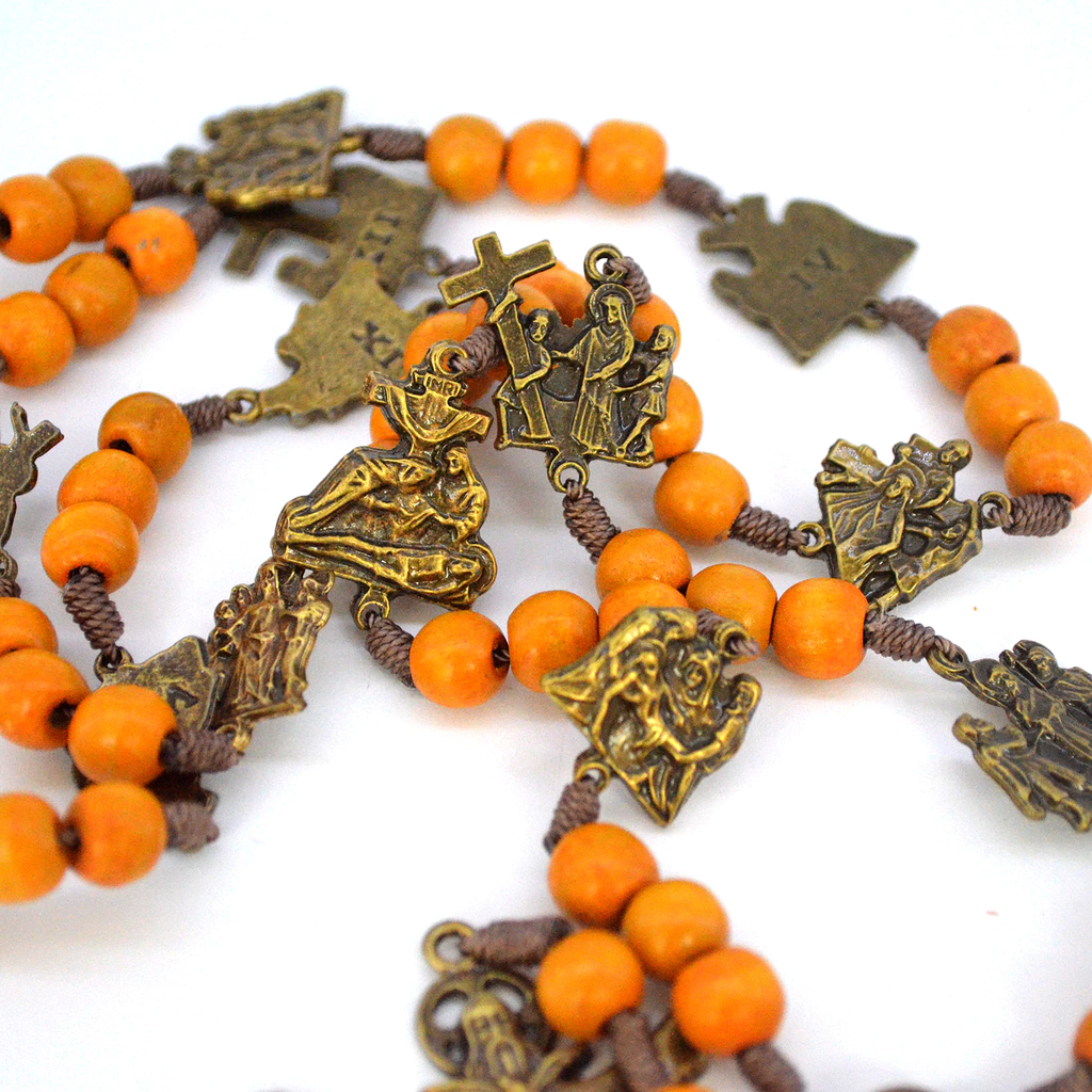 O terço possui as 15 estações da Via Sacra em metais com acabamento ouro velho. As demais contas são em madeira 8mm. Acompanha folheto com as estações da via sacra.